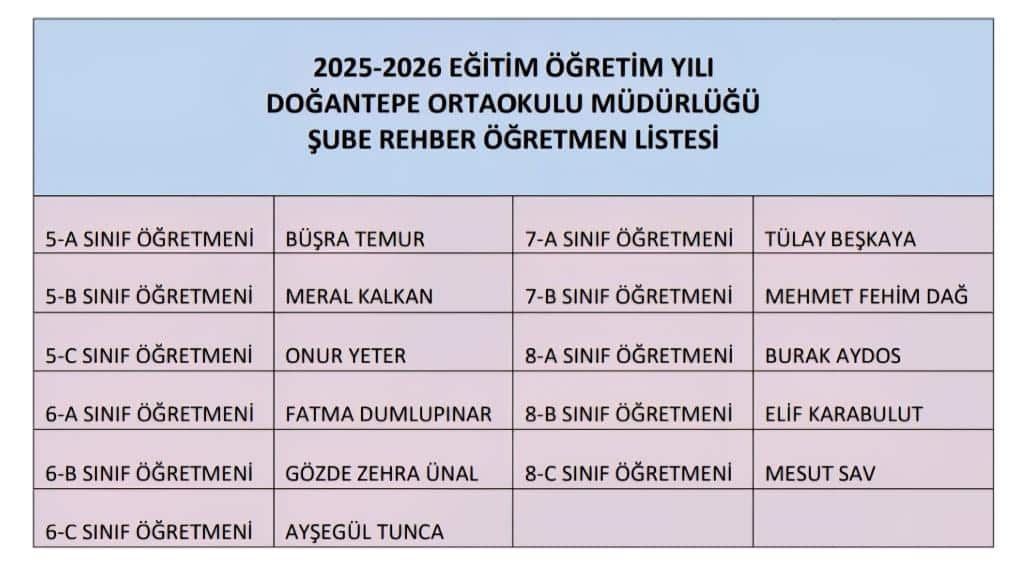 2025-2026 Eğitim-Öğretim Yılı sınıf rehber öğretmenlerimiz. Öğretmenlerimizle görüşmek için web sitemizden randevu alabilirsiniz.